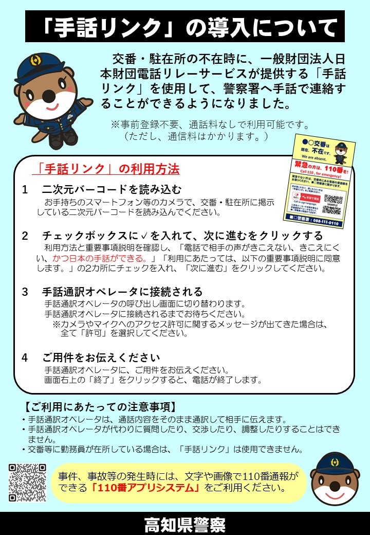 令和8年2月2日から高知県内の交番及び駐在所に『手話リンク』導入されました